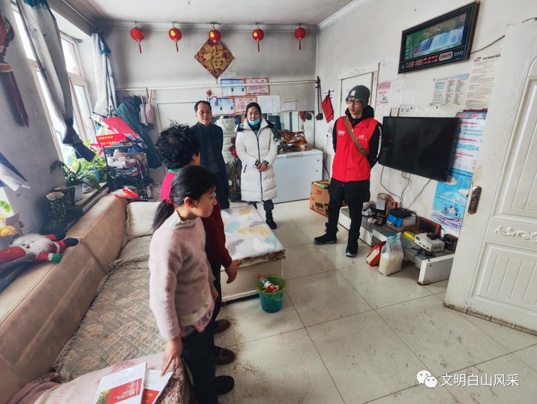2月14日早上,天空飘起了雪花,靖宇县新时代文明实践中心学雷锋志愿服务驿站负责人王吉鹏按计划踏上去往景山镇景山村的关爱之路,看望两名困境儿童。